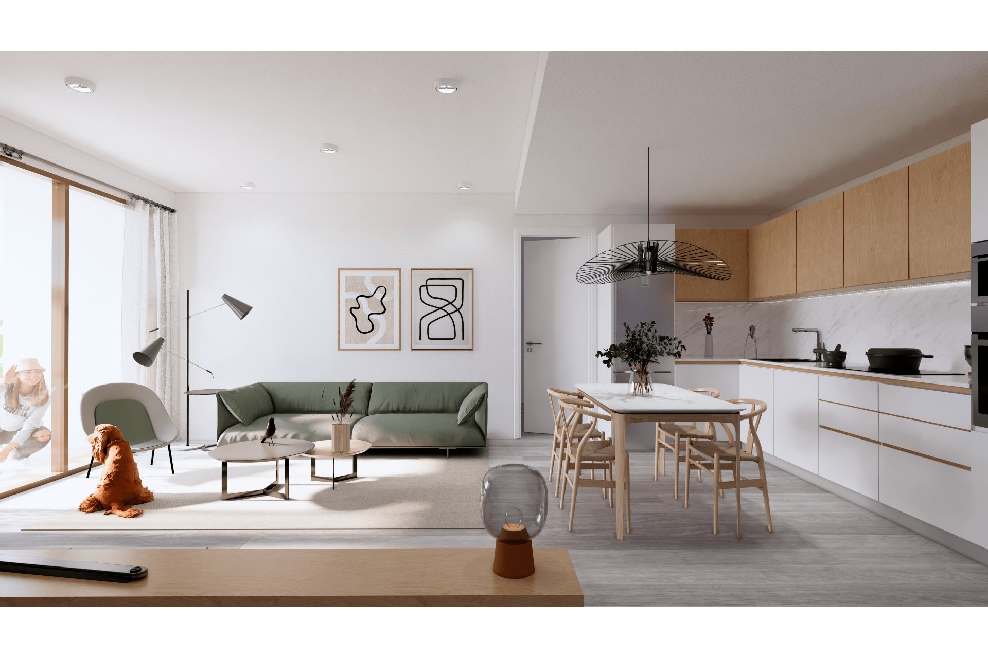 Cocina completamente amueblada y equipada con horno y microondas en columna, frigorífico y lavavajillas integrados, vitrocerámica y campana extractora.
