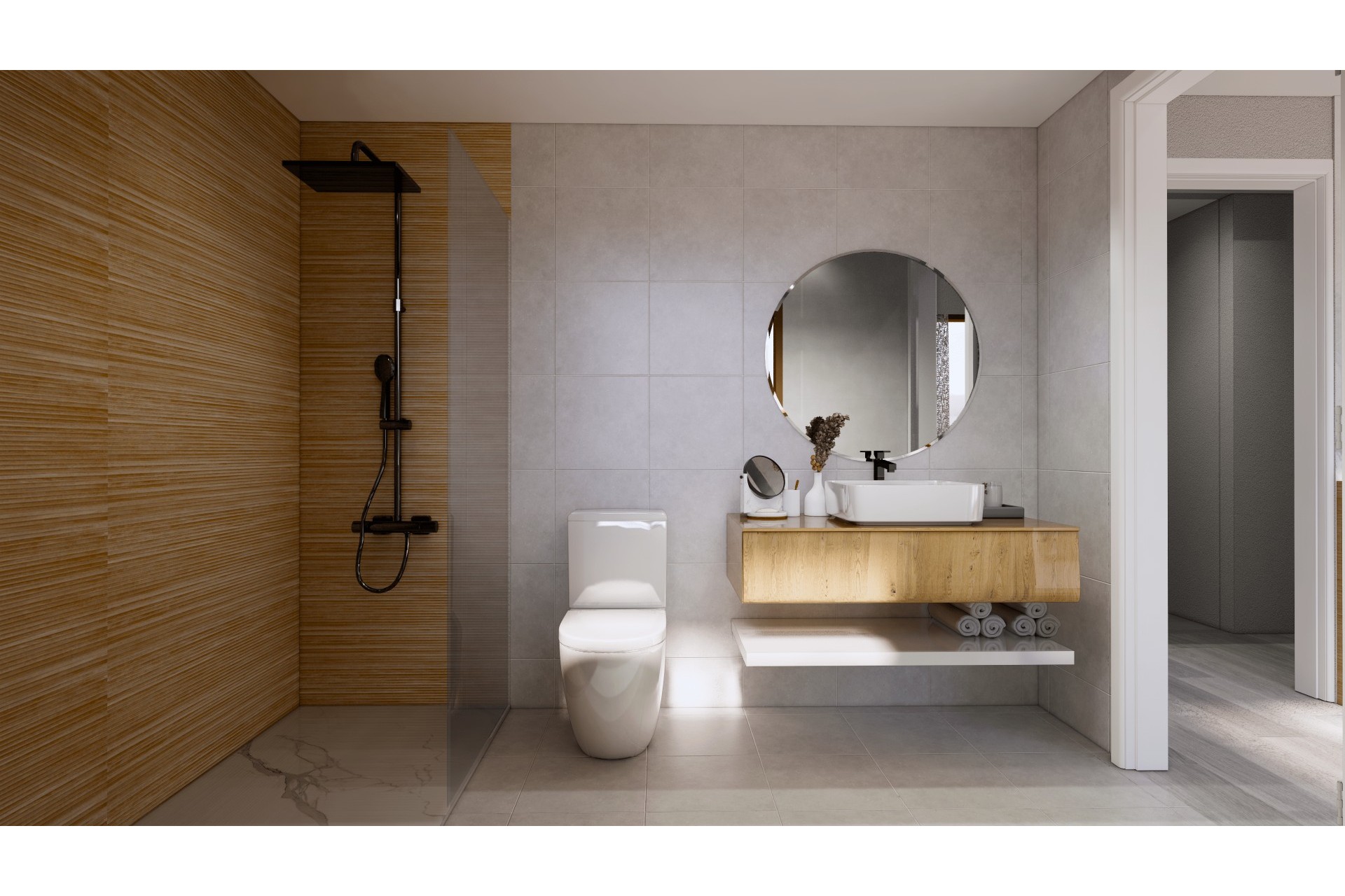 Cuartos de baño totalmente equipados con tocador de diseño, inodoro, espejo y columna de ducha de lluvia con mamparas.