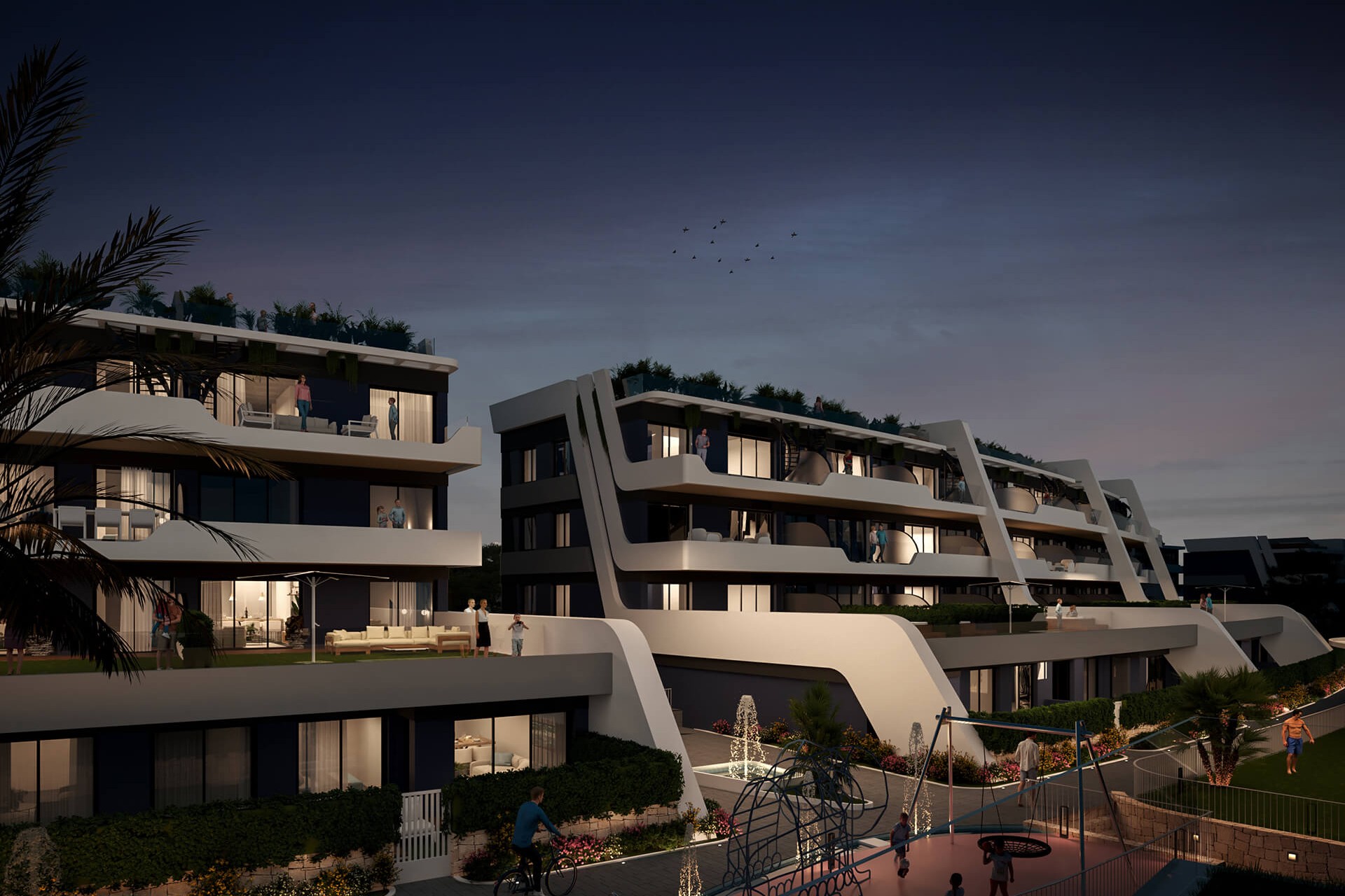 Las viviendas están totalmente equipadas con cocina amueblada, aire acondicionado, mucho espacio exterior, aparcamiento subterráneo, trastero y piscina comunitaria.