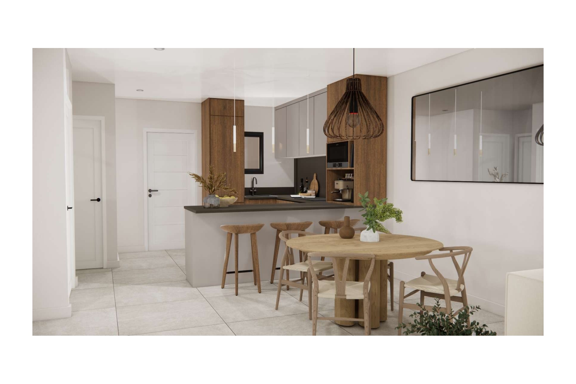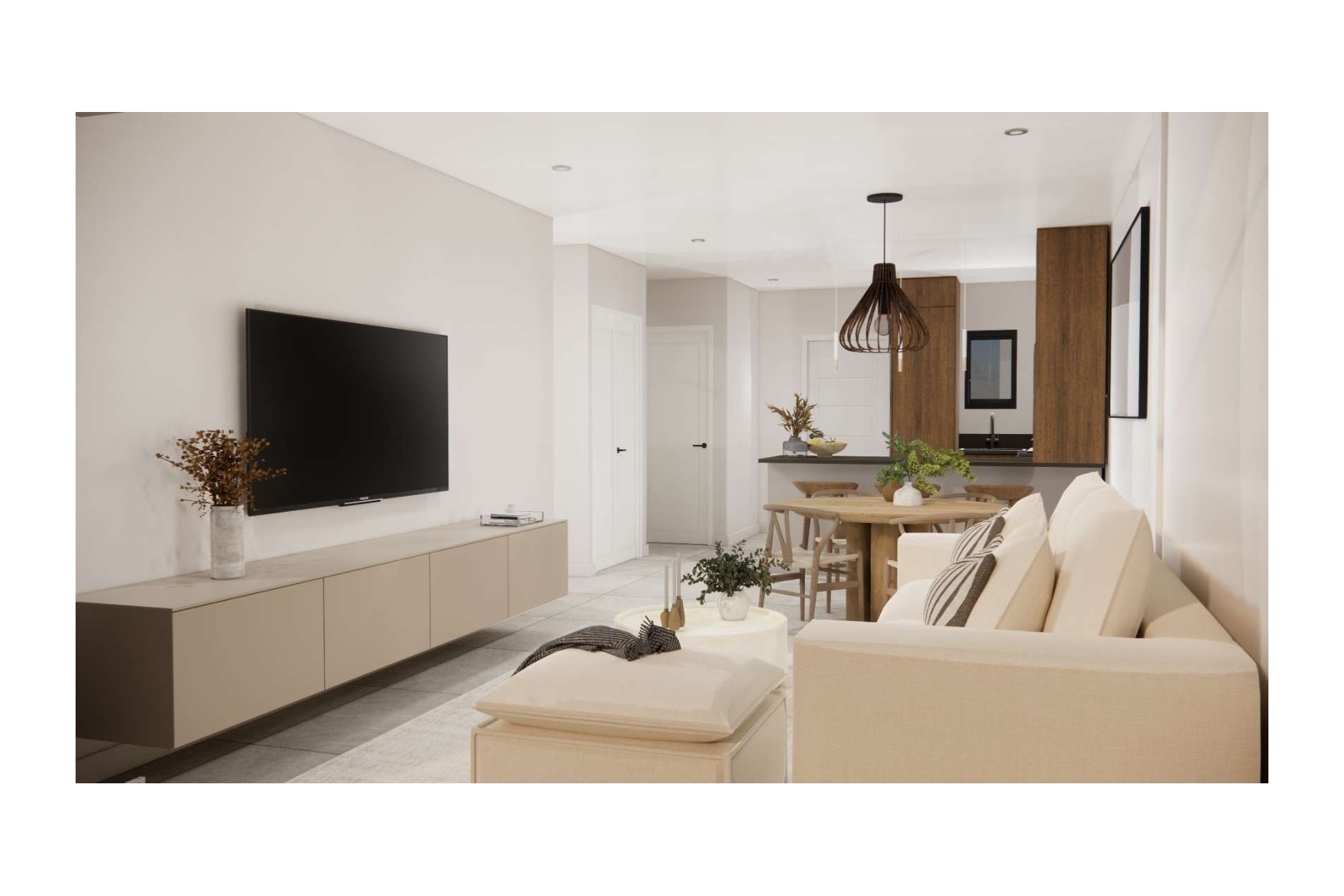 Las viviendas disponen de dos dormitorios, dos baños modernos y una cocina totalmente equipada integrada en el salón. Los grandes ventanales aportan abundante luz natural y una agradable sensación de amplitud.