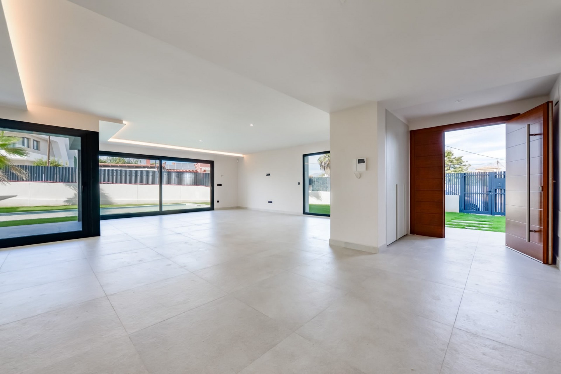 Le salon-salle à manger et la cuisine donnent accès à une impressionnante terrasse avec solarium et zone de détente, complétée par une grande piscine.