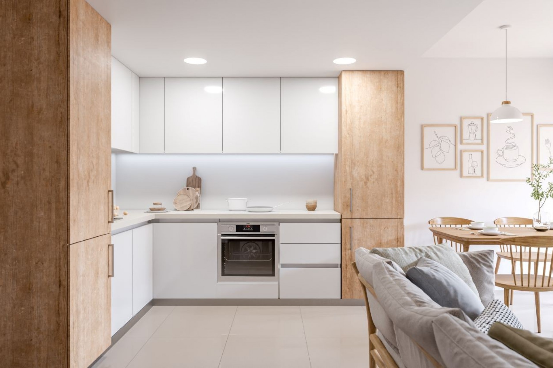 Il dispose de 2 chambres, 2 salles de bain, terrasse et solarium à l'étage supérieur. La distribution de la maison s'articule autour de la cuisine ouverte intégrée à l'espace de vie qui se trouve à l'étage supérieur. Ces dernières maisons ont un accès privé au solarium.