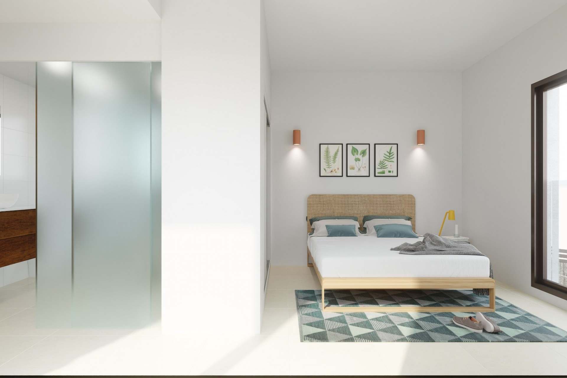 Villa's op percelen van 413 tot 417 m2 ongeveer, met 2 slaapkamers en 1 badkamer, woonkamer met open volledig ingerichte keuken op de begane grond en nog een slaapkamer met badkamer en aangrenzend terras op de eerste verdieping. Met privé tuin en zwembad, airconditioning, alarmsysteem en privé parkeerplaats.