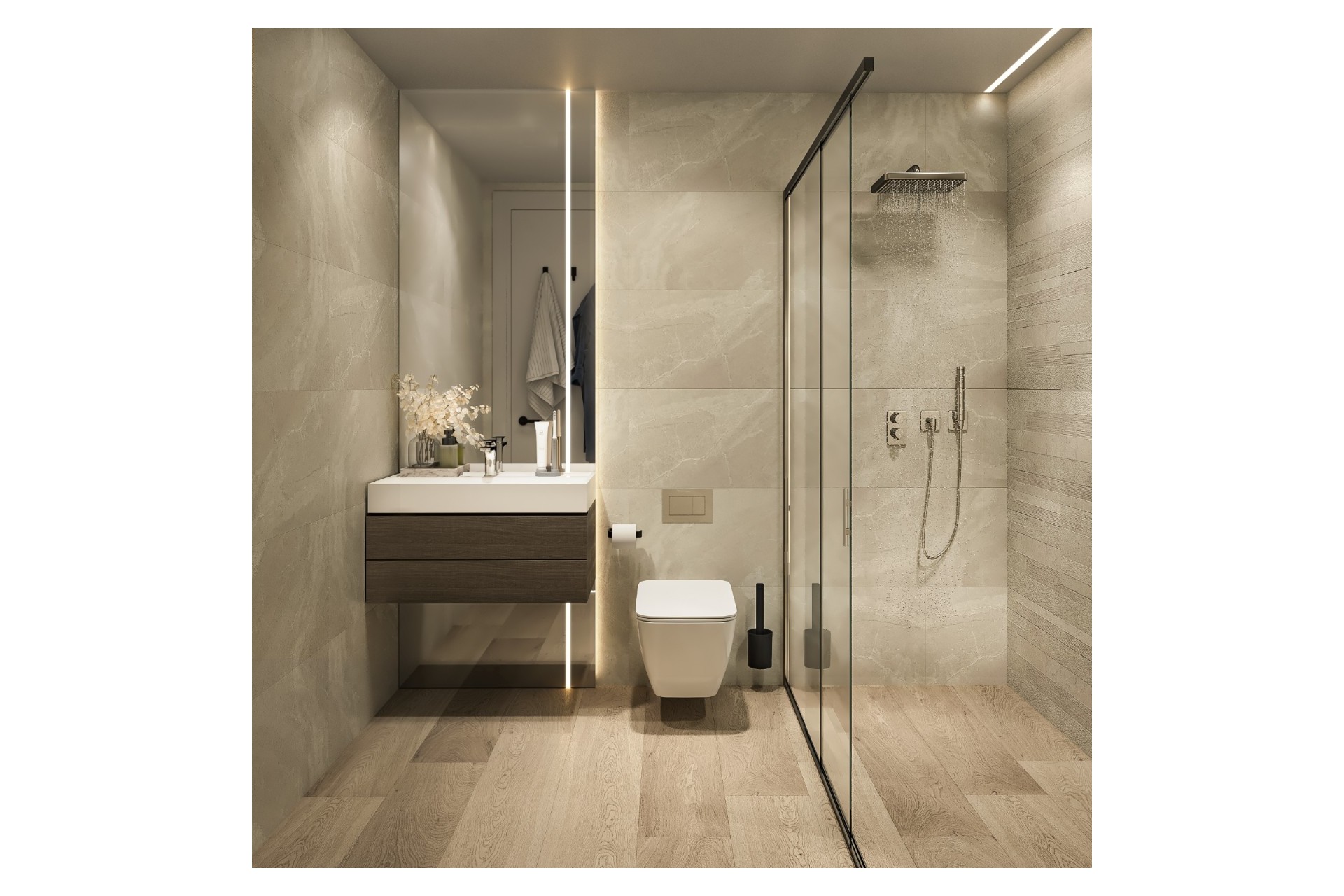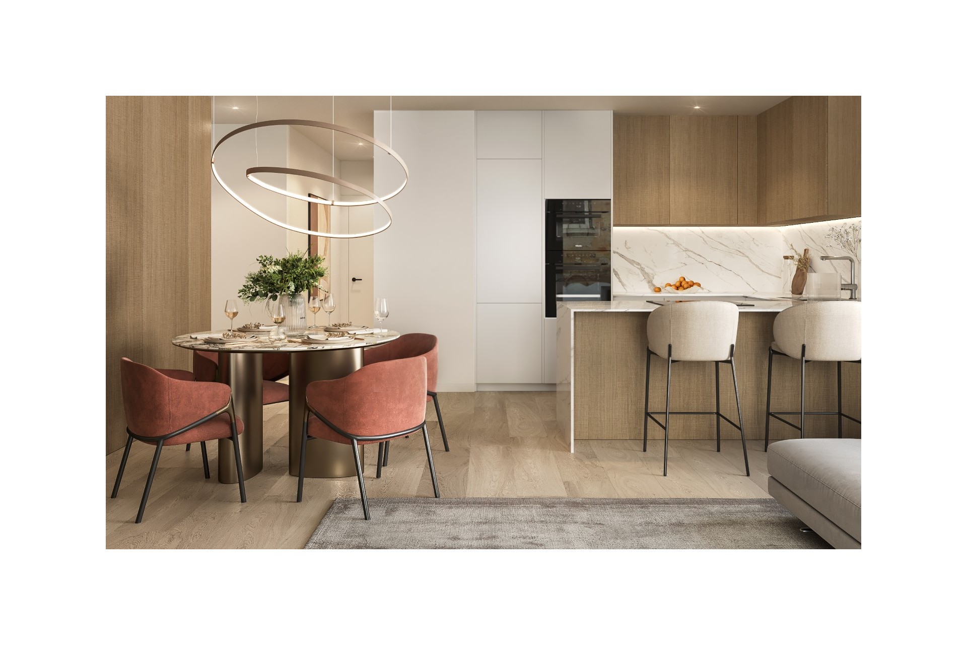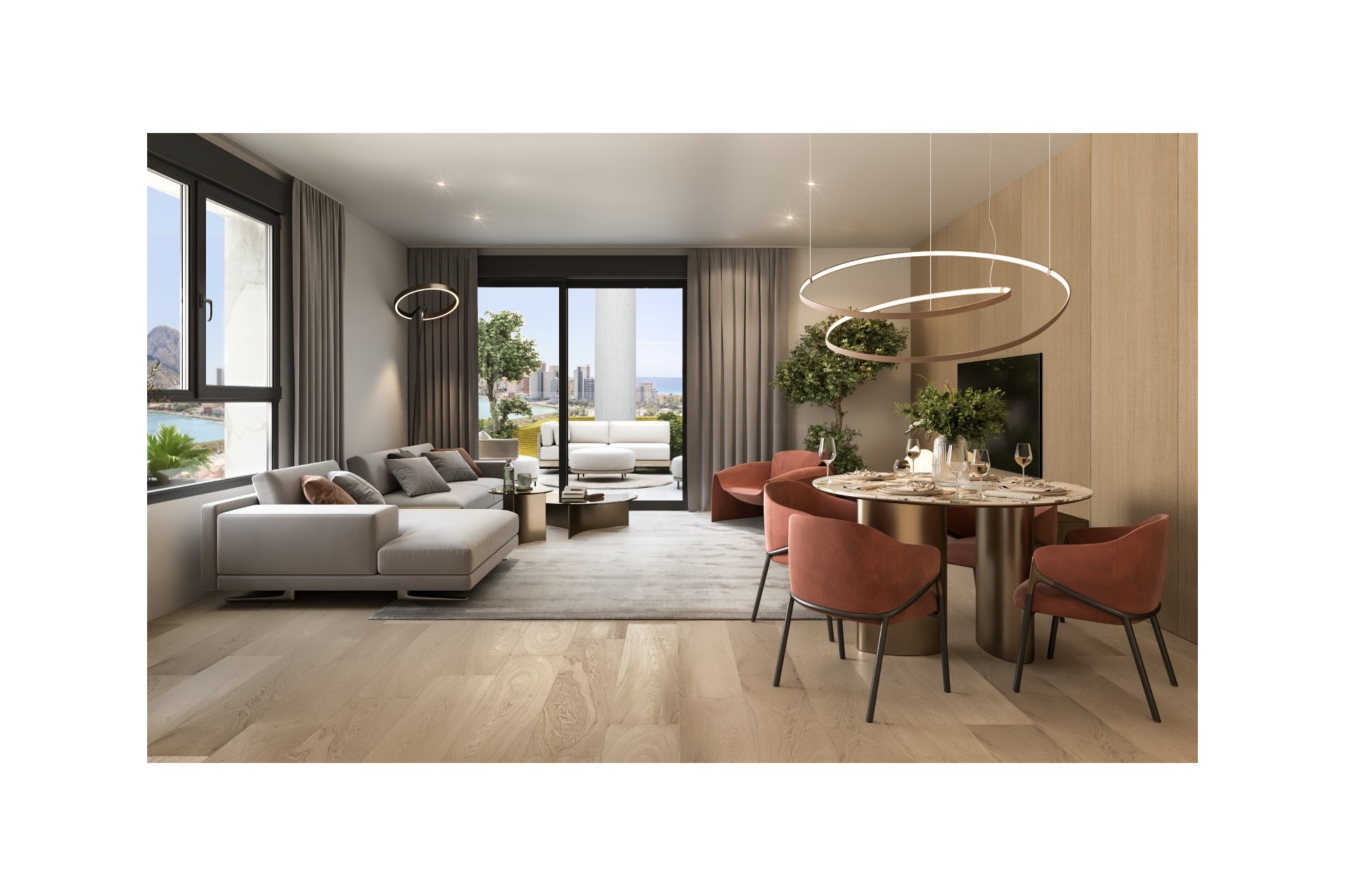 De appartementen met uitzonderlijke, moderne architectuur beschikken steeds over 3 slaapkamers, 2 badkamers, woonkamer met open keuken en directe toegang tot een groot terras. Vanaf dit terras kan u genieten van het spectaculaire uitzicht op Calpe en de Middellandse zee.