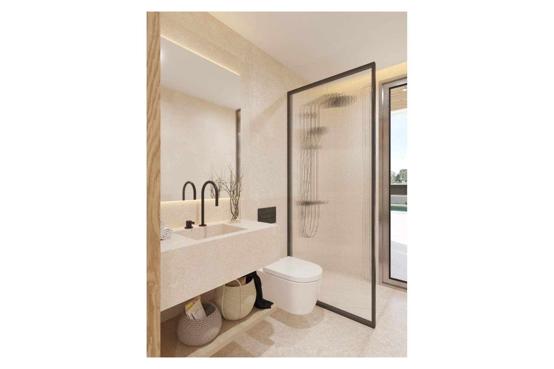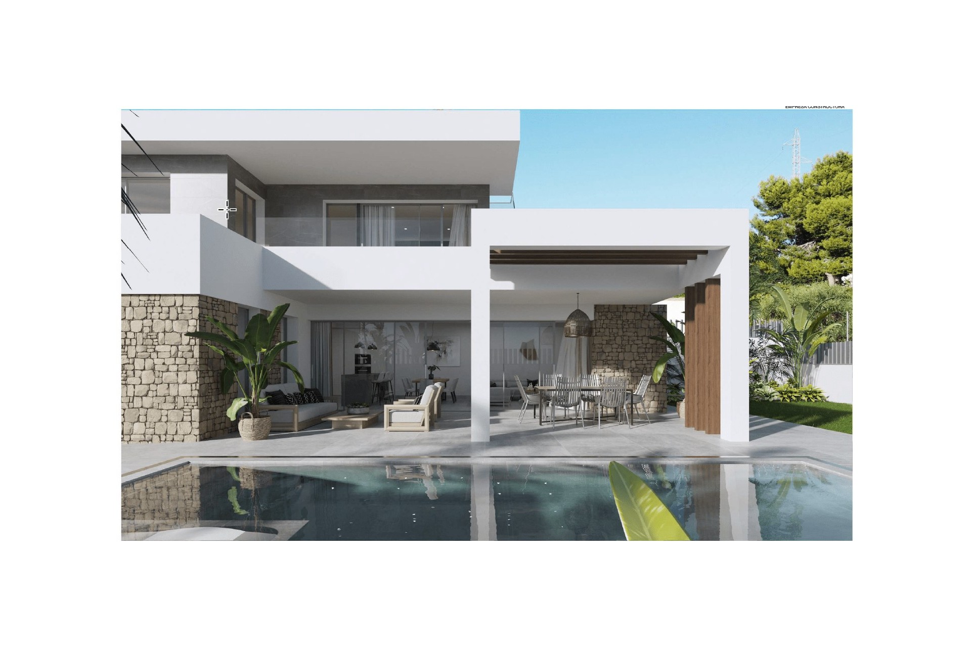 Op het gelijkvloers hebben we vanuit de entree toegang tot de hal waar we het woongedeelte vinden, met open keuken, eetkamer en de woonkamer vanwaar we directe toegang hebben tot het terras. Eenmaal op het terras vinden we het zwembad met een relaxgedeelte waar je kunt genieten van de zon en het uitzicht. Naast de keuken is er ook een toilet. Op dezelfde verdieping, aan de andere kant, is er een grote slaapkamer met eigen badkamer, een gastentoilet en een grote berging.