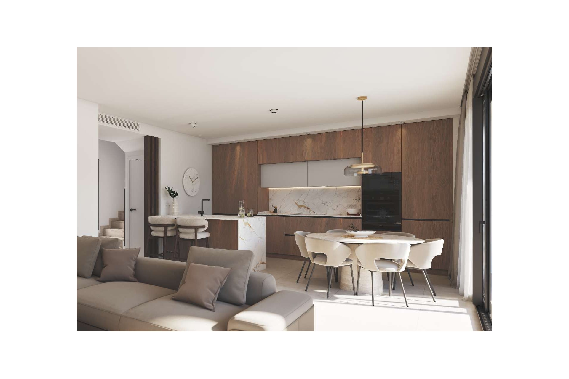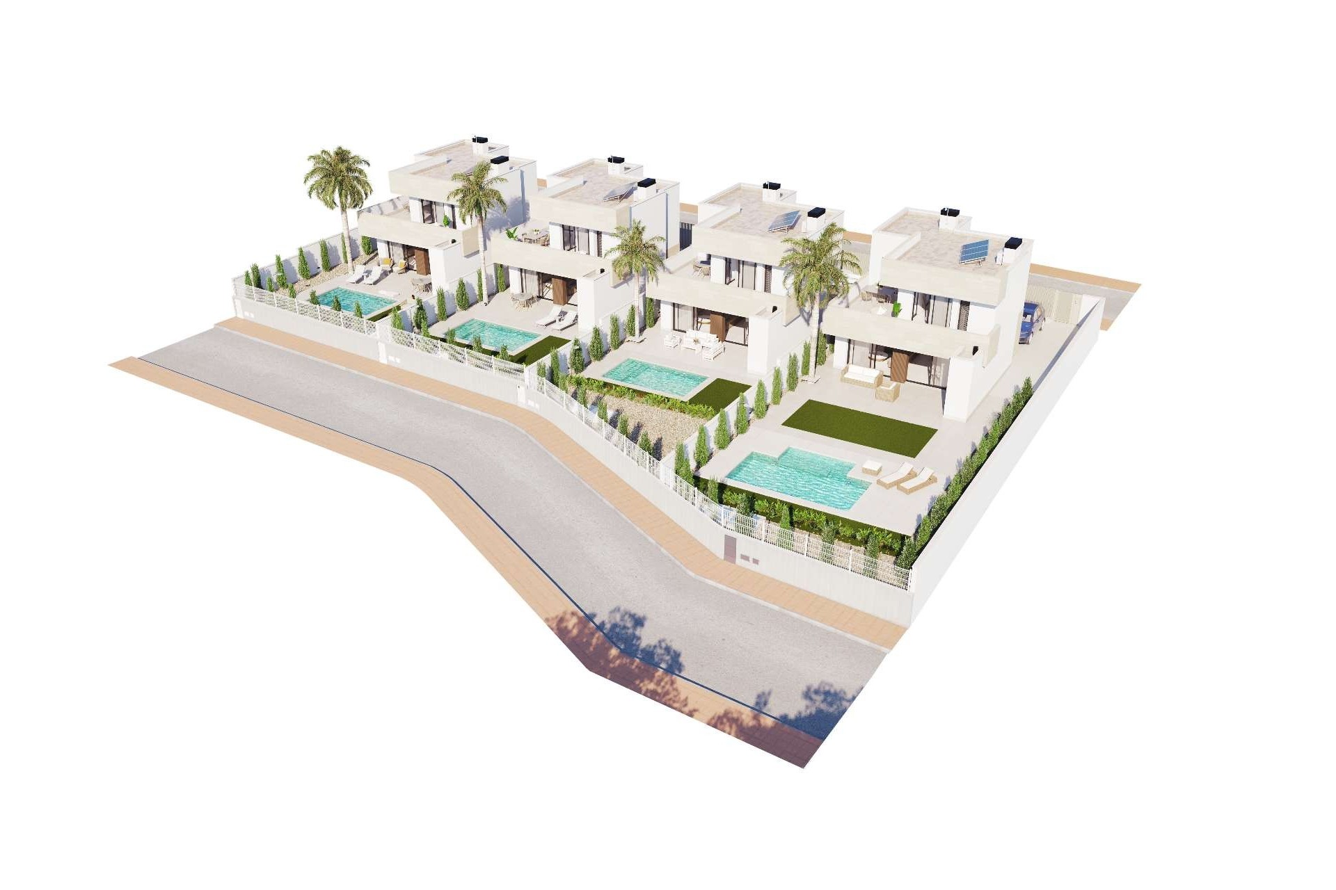 Buiten beschikt elke villa over meerdere terrassen, een prachtig solarium en een privézwembad, perfect om te ontspannen onder de Spaanse zon. De woning is tevens voorzien van een eigen parkeerplaats op het perceel en zonnepanelen, wat zorgt voor extra energie-efficiëntie en lagere energiekosten.