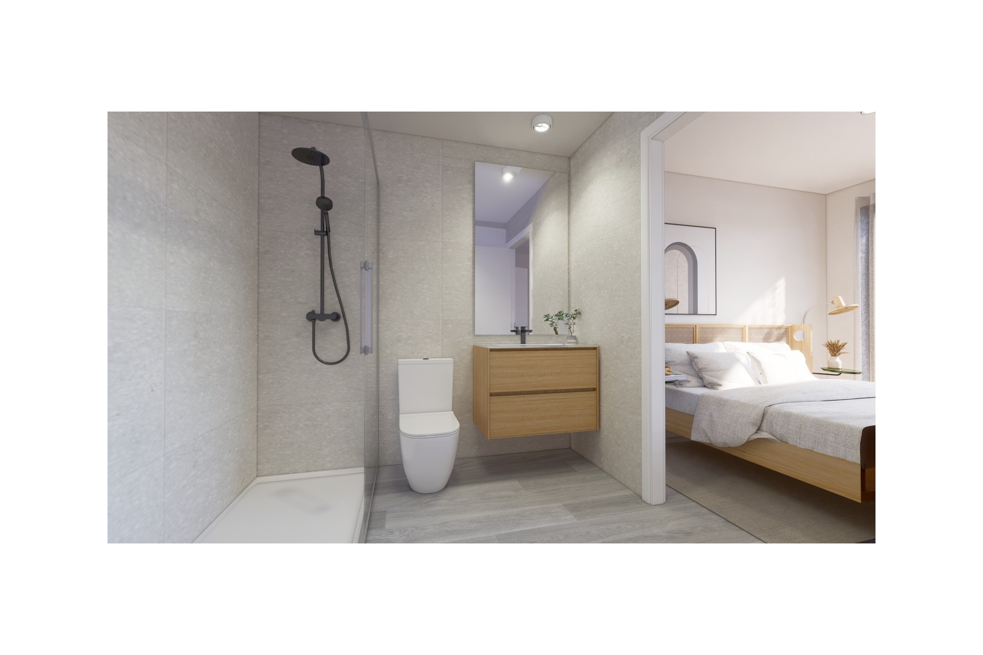 - Top quality porcelain sanitary ware in bathrooms. Design furniture with porcelain washbasins and mirror. Built-in shower column with shower head and non-slip shower tray with concealed drain. Transparent glass shower enclosures.