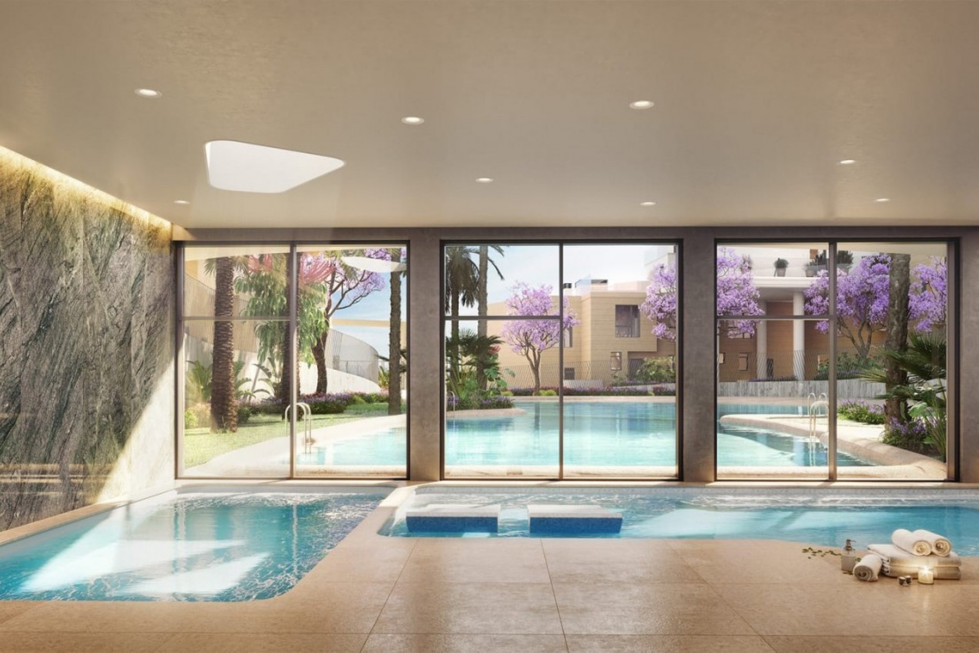 This resort consists of different phases with a choice of apartments and penthouses with 2 or 3 bedrooms and 2 or 3 bathrooms, finished with high-quality materials with fully equipped kitchen appliances from the Bosch brand. The complex has a tropical landscaped communal garden with various outdoor swimming pools for adults and children. Furthermore, the resort offers a heated swimming pool, a jacuzzi, a sauna, a Turkish bath and a fitness room. Each apartment has its own underground parking space with associated storage.