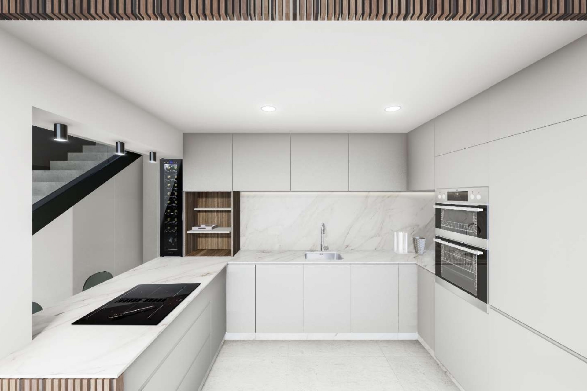 The interior embraces a contemporary open-plan concept, seamlessly connecting a fully equipped kitchen with the living and dining areas to create a bright, airy atmosphere. High-quality finishes and thoughtful features enhance the overall sense of luxury, from motorized blinds and PVC carpentry with low-emissivity glass to integrated wardrobes and pre-installation for ducted air conditioning. The kitchens are delivered fully furnished and include top-brand appliances such as an oven, microwave, fridge, extractor fan, dishwasher, and even a wine cooler.