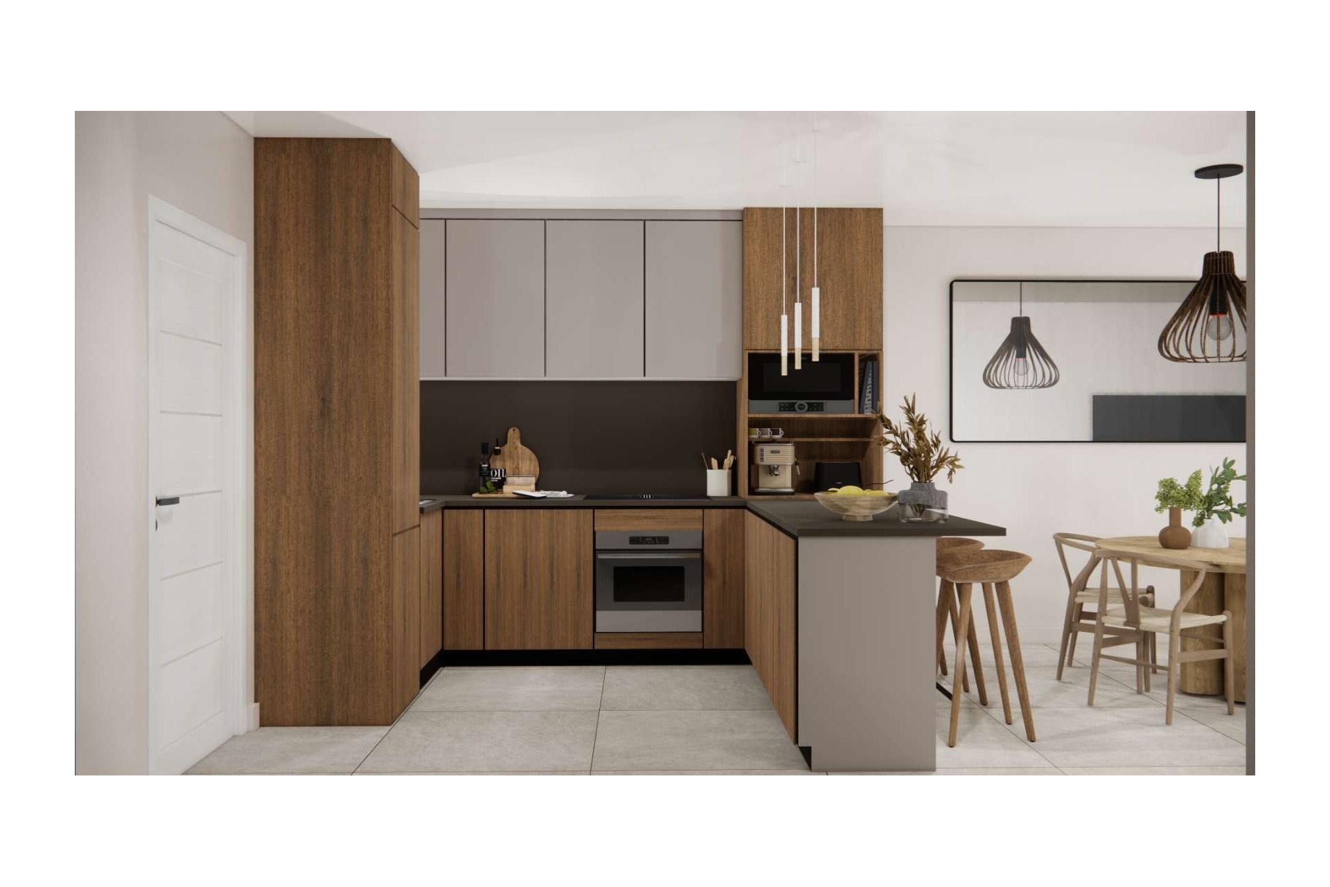 The apartments feature two bedrooms, two modern bathrooms and a fully fitted kitchen that flows seamlessly into the living area. Large windows provide abundant natural light and a pleasant sense of openness.